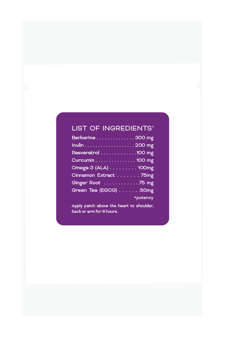 DIRECTIONS: Apply the patch above the heart to shoulder, back or arm for 8 hours. For best results, it is HIGHLY recommended to wear the RESET patch daily, in conjunction with the All Natural GLP-1 patch.
